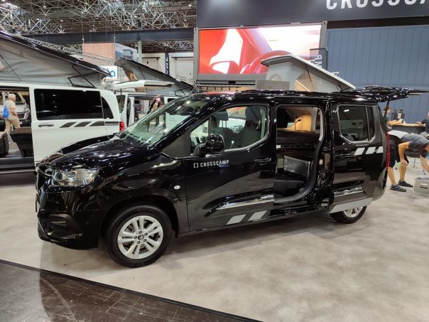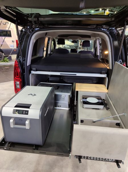 Après avoir élargi son catalogue aux fourgons aménagés , la marque allemande CrossCamp a profité du Caravan Salon pour montrer son intérêt pour le ludospace. Elle a développé un aménagement pour le Toyota Pro Ace City, un module qui permet de convertir la partie arrière en couchage double. De profonds racks coulissants prennent place sous les assises pour disposer d’une glacière et d’une box de rangement (côté gauche).
