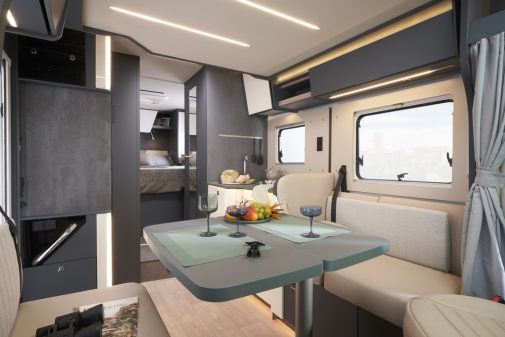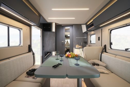 Conçu sur le châssis Fiat Ducato à voie arrière élargie et empattement long, ce profilé de 7,40 m de long propose une implantation bien dans l'air du temps. Il répond aux fortes demandes des camping-caristes sur ce secteur avec, pour commencer, un salon face-face en partie avant. Ce dernier peut accueillir jusqu'à cinq convives autour de la table sur pied décentré et avec un plateau au format global carré. Ce dernier peut se replier par moitié pour favoriser la circulation en libérant un large couloir.