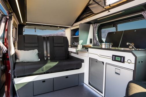 D'un point de vue agencement, ce van est le plus court que propose le constructeur dans son catalogue. En effet, ce modèle affiche un gabarit de 5,08 m de longueur mais surtout une hauteur de 2 m. En revanche, une fois le toit levé, la hauteur intérieure est logiquement plus importante et permet de profiter d'un couchage double de 139 x 190 cm. Il est complété en partie basse pas le banquette convertible elle aussi en couchage double. A noter que ce véhicule est homologué pour quatre personnes sur route avec une assise arrière pour deux passagers. Sur ce modèle, outre le meuble cuisine avec évier, réchaud et frigo de 49 l, Hanroad a souhaité loger une douchette extérieure. Une aubaine car ce véhicule embarque 60 l d'eau propre. Point de vue chauffage, ce Trek 4 bénéficie d'un combiné gasoil de 2000 x avec un kit d'altitude.