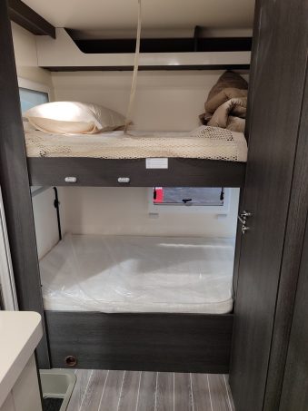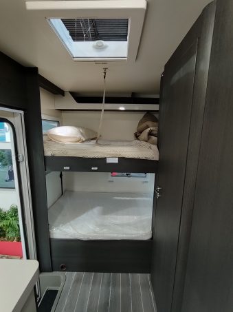 Niveau implantation, ce 274 TL s'adresse bien aux familles. En témoigne, les lits superposés en partie arrière de 90 cm de large et plus de 200 cm de long. Ils peuvent donc convenir à des jeunes enfants, des adolescents voire à des adultes. La partie avant octroie une place gigantesque au salon. La grande banquette latérale et celle en L, à l'opposé, peuvent aisément recevoir jusqu'à 8 convives autour du vaste plateau de table. Cet espace peut également convenir pour quatre passagers en usage route. Avec les sièges du porteur, ce véhicule affiche donc une homologation carte grise pour six personnes. Le coin repas est surmonté d'un vaste lit de pavillon double.