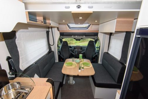 Il surmonte le coin repas qui se compose, pour sa part, de banquettes en vis-à-vis. A noter toutefois que seule la banquette côté gauche dissimule des assises homologuées carte grise, le constructeur ayant fait le choix de faire voyager les passagers arrière face à face. Pour la cuisine, l'ameublement se révèle tout à fait cohérent, compte tenu de l'espace, avec tous les équipements nécessaires dont un grand frigo de 133 l avec un compartiment freezer de 12 l intégré. La place du poste culinaire a été volontairement contenue afin de conserver une salle d'eau convenable. Sur ce Qwest 696 G, Bavaria mise sur une douche indépendante du cabinet de toilette. Les deux zones peuvent toutefois être réunies pour évoluer dans un compartiment plus spacieux.