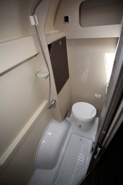 Juste à côté, la salle d'eau se montre relativement spacieuse malgré les dimensions compactes du véhicule. Cabine de douche et cabinet de toilette sont réunis en un seul et même espace.
