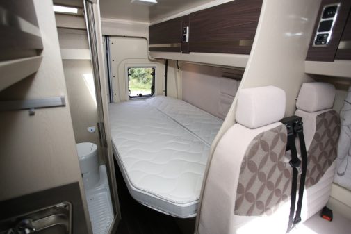 Voilà un fourgon qui sort de l'ordinaire. Surtout en partie arrière. En effet, on y découvre un couchage plutôt original dans un fourgon : un lit à la française ! L'italien Rimor a donc fait installer un sommier qui se rabat afin de libérer le couloir pour ranger des équipements volumineux comme un vélo ou accessoires de camping. A l'étape, le sommier se déplie pour former une beau lit double dans la longueur.
