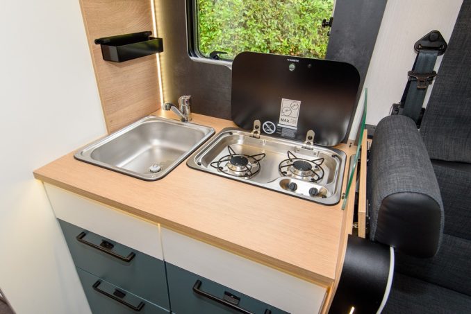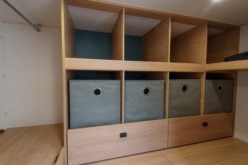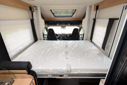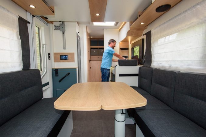 Le salon est surmonté d’un lit de pavillon électrique de 140 x 200 cm qui s’abaisse jusqu’aux banquettes et remonte facilement. On peut également l’arrêter à mi-hauteur pour préserver l’espace en-dessous et utiliser le lit simple de dînette (98 x 200 cm).