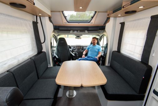 L’A656 D se distingue notamment par son ambiance intérieure et son mobilier inédit Sherwood Green. On apprécie le salon qui se compose de deux banquettes latérales face-face, dont les dimensions sont impressionnantes (en particulier le sofa derrière le siège conducteur). Cette longue banquette se transforme en deux sièges face et dos à la route. Ces assises ceinturent une grande table dont le plateau est fixé sur un pied déporté. Cette disposition améliore la circulation, mais gêne malheureusement l’accès à l’assise de gauche.