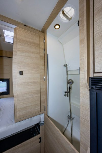 L'innovation intéressante sur ce fourgon réside au niveau de la salle d'eau et plus précisément la cabine de douche dans laquelle est implantée une penderie. Pour entrer dans la douche, il suffit de faire pivoter la penderie pour accéder à une cabine brevetée Modul'Space.