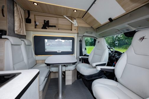 Dès l'entrée dans la cellule, on prend conscience que les larges dimensions du fourgon sont justifiées. En effet, on découvre un maxi salon avec une banquette en L. Notez que ce véhicule est homologué 4 places carte grise. Les sièges de cabine peuvent également pivoter pour ajouter plus de convives autour de la table. Le bloc cuisine qui vient compléter l'espace salon est classique. Il est composé d'un réchaud deux feux, d'un grand évier inox et de tiroirs de rangements.