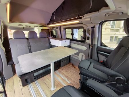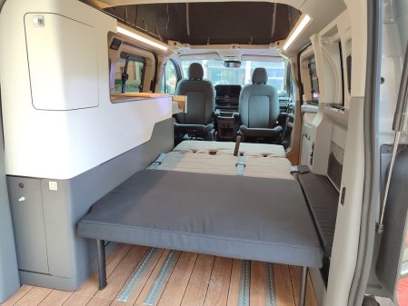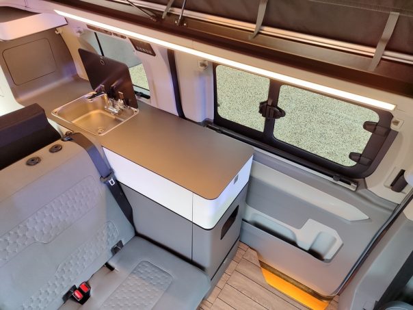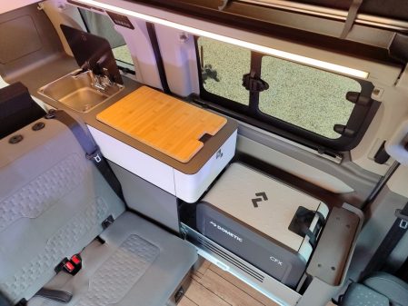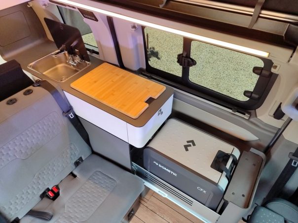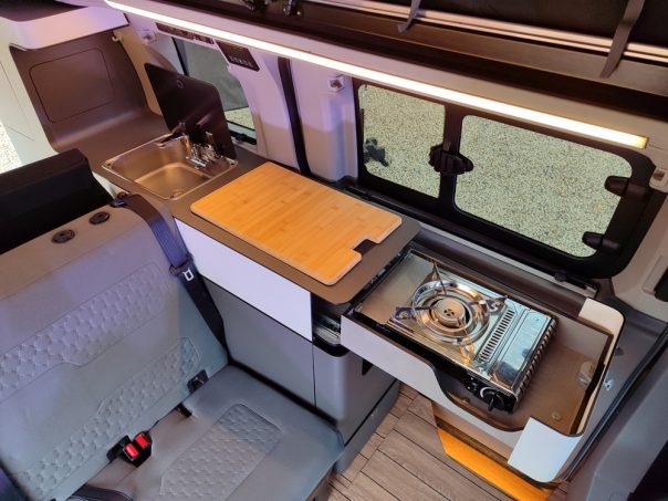 Pour agrémenter cet espace, le City Camp reçoit un meuble sur son flanc gauche. Cet élément fait preuve de modularité afin de ne pas obstruer la deuxième porte coulissante côté conducteur. Ainsi, le réchaud de la cuisine est intégré dans un tiroir, de même que la glacière de 25 l.