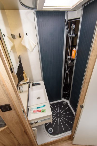 Au niveau de la salle d'eau, le bureau d'études a fait un travail intéressant en matière de modularité. L'espace octroyé au poste sanitaire est généreux, mais pour autant Le Voyageur a souhaité offrir à chaque élément le plus de confort possible. Ainsi, le lavabo contenu dans la paroi coulisse lorsqu'il y a besoin. Idem pour le WC qui se tire également à la manière d'un tiroir. Pour la douche, des rideaux à lamelles viennent constituer la cabine de douche (84 cm de diamètre) et isoler l'ensemble du reste du cabinet de toilette.