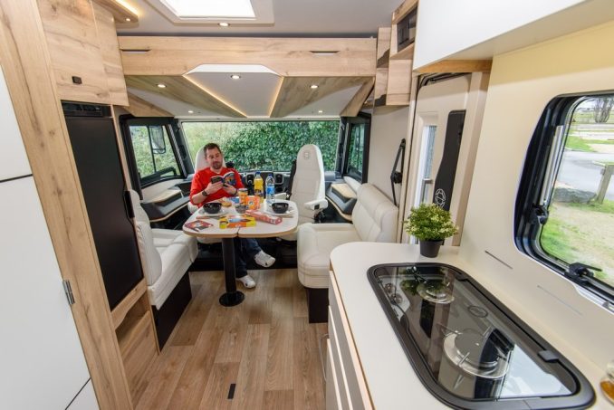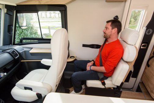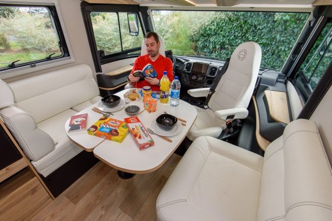 Comme il est souvent de coutume avec ce genre de lits, on retrouve une grande soute garage sous les sommiers. Sur ce modèle, c'était une priorité pour le constructeur de pouvoir profiter d'un espace de rangement avec une hauteur constante de 1,20 m. Pari réussi puisqu'outre ce tirant d'air, l'espace bénéficie d'une profondeur de 90 cm et d'une largeur de 2,23 m offrant ainsi un volume de 2,40m3. En partie avant, le salon se compose de banquettes en vis-à-vis associées aux sièges pivotants Aguti du poste de conduite. L'ensemble peut accueillir quatre convives autour de la table mais également lors d'une utilisation route. En effet, les assises latérales se transforment en sièges homologués avec ceintures de sécurité. C'était là-aussi une volonté du constructeur de pouvoir disposer d'une homologation pour 4 passagers sans basculer pour autant dans la catégorie PL, tout en conservant une charge utile cohérente de 458 kg.
