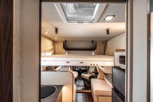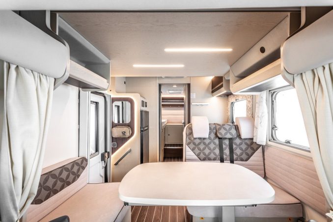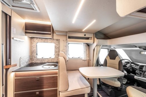Au niveau du salon, on découvre une banquette face route qui s'accompagne d'un petit sofa positionné à droite de la porte d'entrée de la cellule. Les sièges cabines pivotent. Au total on dénombre donc 5 places autour de la table.
