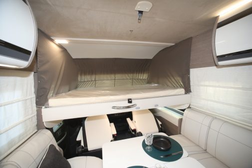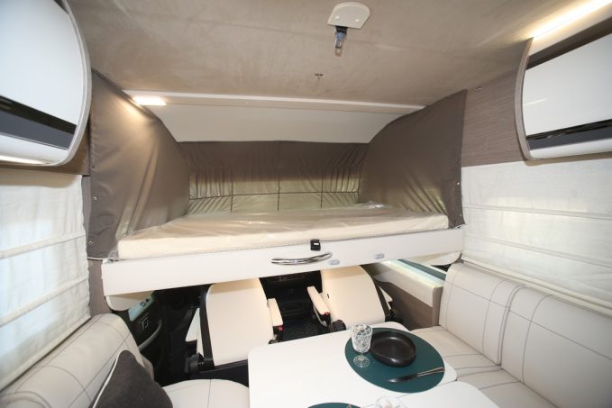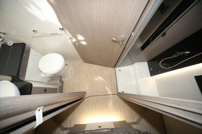 Pour l’heure, donc, nous avons affaire à deux unités de 7,47 m de long gréées sur Fiat Ducato ou Citroën Jumper en motorisation de 140 ch, fabriqués dans l’usine SEA de Poggibonsi, à quelques encablures de Sienne, en Italie. Une attention toute particulière a été apportée à l’ambiance, très agréable, mais aussi aux matériaux, notamment leur poids (matières, process de fabrication, épaisseur de certains panneaux…) afin de garantir une belle charge utile (470 kg annoncés), et un équipement fourni (régulateur, clim’, boucliers peints, sièges de cabine assortis (signés Agutti sur l’intégral), qui devient pléthorique grâce à un pack optionnel Ready To Go (stores extérieur et occultants, jantes alliage, moustiquaire, panneau solaire, jantes alliage, lit de pavillon sur le profilé, chauffage Combi 6E…).