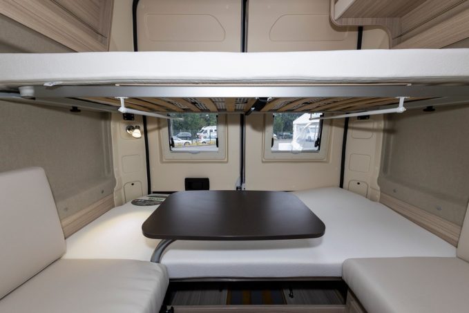 La collection 2024 de Dreamer ne compte plus de van à toit relevable. En effet, le petit Cap Life sur Ford Transit Custom tire sa révérence. Du moins temporairement, en attendant un éventuel retour lorsque la nouvelle mouture de la base sera disponible… Le catalogue se compose donc exclusivement de fourgons, que nous connaissons bien. Premier sur la liste, par ordre de longueur, le D43 Up de 5,41 m. Une proposition classique (lit transversal, salle d’eau trois postes fixes, cuisine à l’entrée et banquette duo face route), qui se caractérise par son toit relevable de série, et donc ses quatre places couchage. En 6 m, nous retrouvons le D55 et sa douche séparée avec penderie pivotante sans toit relevable ou avec (Up) ainsi que le D51, arrivé l’an dernier, sur Ford Transit (les D43 et D55 reposent sur Peugeot Boxer) à l’implantation éprouvée (lit transversal…) et disposant d’une salle d’eau modulable grâce à une paroi pivotante. Le CamperFive, enfin, repose sur Fiat Ducato grande hauteur (2,88 m) et propose un plan pour le moins original. Si l’ensemble salon avant, cuisine et salle d’eau reste dans les standards, la partie arrière est unique avec des lits superposés dont celui du bas, extensible, peut accueillir un deuxième dormeur ou s’escamoter pour laisser place à une dînette pour deux enfants.