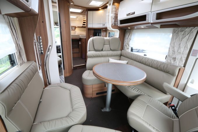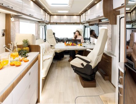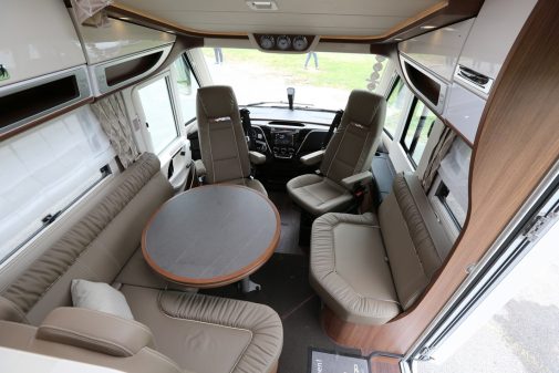 Dans la cellule, on dispose de quatre couchages permanents de grand confort. Un premier matelas double dans la capucine. A l’arrière, dans la chambre, on profite des lits jumeaux (comme ici) ou d’un lit XXL grâce à l’ajout de matelas pour réunir l’ensemble. Le Cruiser 891 LR propose aux occupants de se retrouver dans le salon, un coin composé de deux grandes banquettes en L positionnées latéralement. A l’étape, ce poste accueille aisément jusqu’à huit convives.