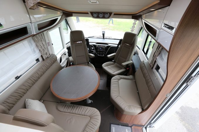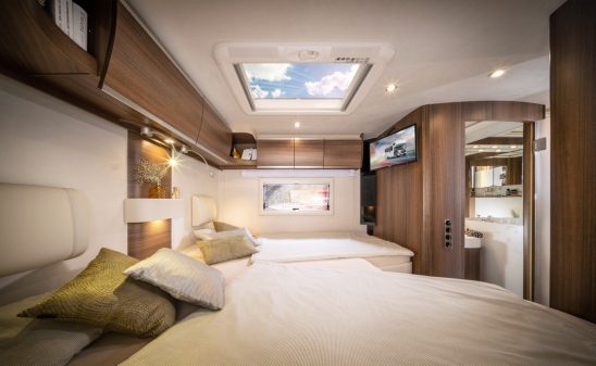 On accède à un vaste salon, constitué d’une confortable banquette en L, d’un sofa latéral et des sièges du poste de conduite. Cinq personnes y prendront place. Le plateau de table est circulaire, rappelant les courbes du mobilier en cuisine. En partie arrière, ce I 50 LE adopte de grands lits jumeaux de 85 x 203 cm accessibles depuis un escalier central. Sous le sommier, se trouve une énorme soute garage permettant de loger des deux-roues motorisés ou plusieurs vélos. Côté nuit, la salle d’eau offre un espace en deux parties avec une vaste douche faisant face au cabinet de toilette. A l’instar des lits jumeaux qui peuvent être réunis pour former un très grand couchage, ce poste peut s’envisager en transversal grâce à la porte double emploi des WC et une paroi à galandage.