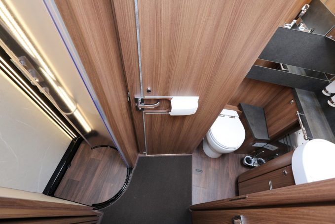 En effet, en plus de la vaste banquette latérale, il se distingue par une grande table-bar extensible jusqu’à 1,43 m et par un siège individuel – similaire à ceux du poste de conduite, pour un confort optimal aussi bien à l’étape que sur route. Le cuisine dispose d’un réchaud 3 feux, d’un évier et d’un réfrigérateur de 118 l (+ 49 l). La terminaison QD indique qu’en partie arrière, on retrouve un lit central de 160 x 210 cm. Cette chambre s’accompagne d’une vaste salle d’eau en deux parties qui peuvent être réunies par un jeu de portes à galandages discrètes et parfaitement isolantes.