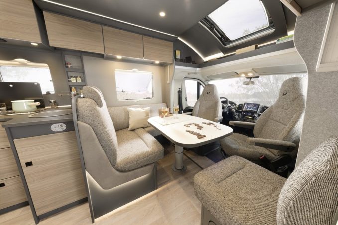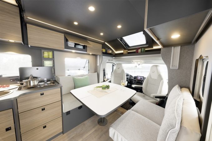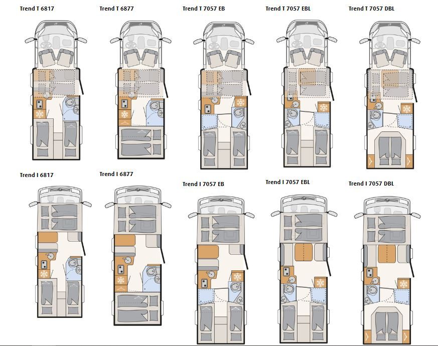 En ce qui concerne la composition de cette gamme, Dethleffs a décliné les mêmes implantations en profilé et en intégral, ce dernier offrant un couchage double supplémentaire en cabine de série, là où le lit de pavillon électrique est disponible en option dans la famille des profilés. Les agencements proposent trois variantes de couchages avec un lit transversal présent dans les T/I6877, trois lits jumeaux logés dans les T/I 6817 EB, T/I 7057 EB (avec dînette classique) et les T/I 7057 EBL (salon face-face). Ce dernier plan est décliné en version lit central à travers les modèles T/I 7057 DBL.