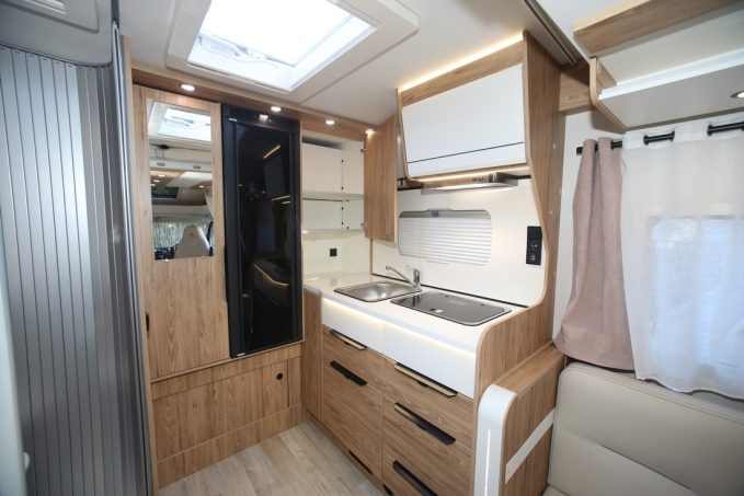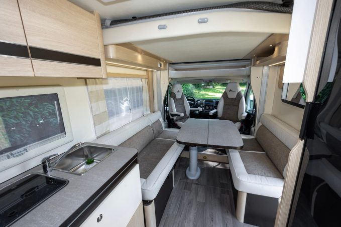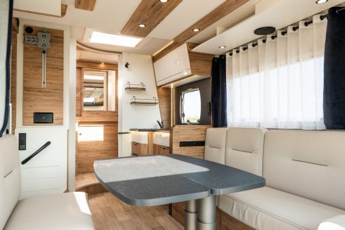 Le profilé le plus compact du catalogue Autostar, le P600 Performance, propose une grande habitabilité à bord. Ce modèle de 6,13 m de long est pourvu d’un salon face-face pouvant accueillir jusqu’à six personnes. A l’étape, le lit de pavillon offre un couchage de 140 x 190 cm avec un biseau en pied réduisant la largeur à 115 cm. Il est secondé, si besoin, par un couchage en dînette de 140 x 200 cm. La zone arrière est occupée par une salle d’eau transversale avec un dressing sur soute garage.