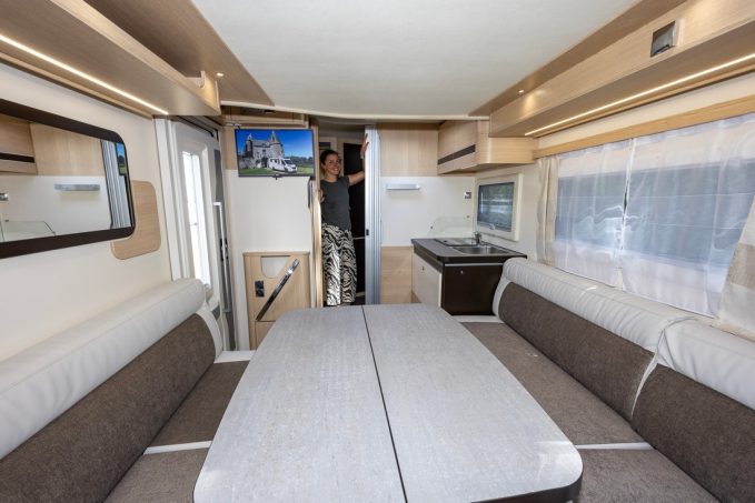 Le Bavaria T696D est devenu un modèle incontournable. Dans ce profilé de 6,99 m de long, la marque a repris tous les codes qui font le succès des modèles sans lit au plancher : un salon pour six personnes, un couchage de 160 x 200 cm, une cuisine fonctionnelle et vaste, une salle d’eau traversante accueillant un vaste dressing. Ce véhicule est disponible en finition Unik (à la carte), étonnement plus onéreuse que la version Nomad Fit qui intègre, de série, les trois packs indispensables (Confort, Energie AGM et Media).
