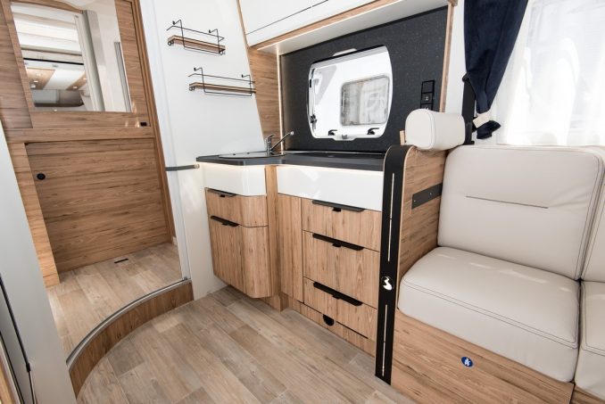 Avec son implantation singulière, le T626D n’a encore aucun équivalent sur le marché. Dans ses 6,20 m de long, Bavaria a installé un salon face-face surmonté d’un lit de pavillon de 160 x 200 cm. La salle d’eau est dotée d’une cloison pivotante pour obtenir une cabine de douche. La cuisine reçoit un frigo plaqué contre le panneau arrière, à côté du dressing. Dans la configuration Nomade Fit, Bavaria a sélectionné trois packs -les plus appréciés- pour les intégrer de série au véhicule, alors commercialisé à 72 900 €.