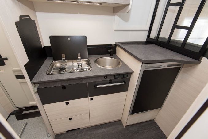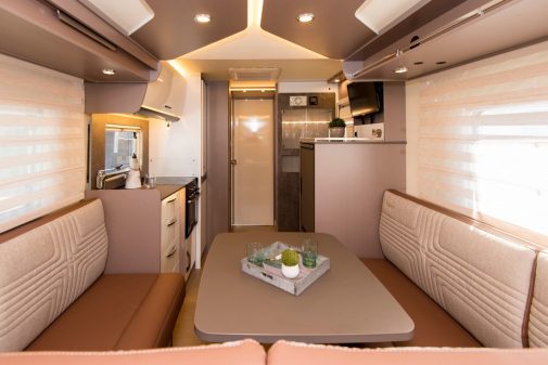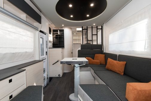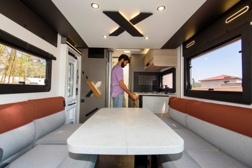 Le profilé 240 de Challenger se distingue par ses deux portes d’entrée, situées de part et d’autre de la cellule (celle à l’arrière gauche permet de monter à bord en passant par le garage). La deuxième singularité du véhicule est son agencement hors pair. En partie avant, le salon (immense) peut accueillir jusqu’à huit personnes, qui prendront place sur les banquettes, le sofa, les sièges de cabine et les poufs amovibles. Tout aussi étonnante est la cuisine, séparée du living par une verrière. Dans la salle d’eau, une paroi pivotante optimise l’espace. Enfin, tout l’arrière est occupé par le garage, une épatante zone de rangement.