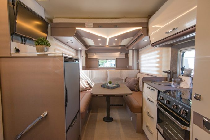 L’implantation du Lyseo Gallery 689G est identique à celle du TD684, à la différence près que le Gallery est pourvu de cette fameuse casquette qui, une fois levée, dévoile une chambre en mezzanine, flanquée de l’unique couchage du véhicule. Les dimensions de ce lit sont de 150 x 200 cm. En partie basse, on profite d’un salon avec une banquette en L, d’une cuisine avec retour et d’une grande salle d’eau transversale. L’ensemble logeant à l’arrière.
