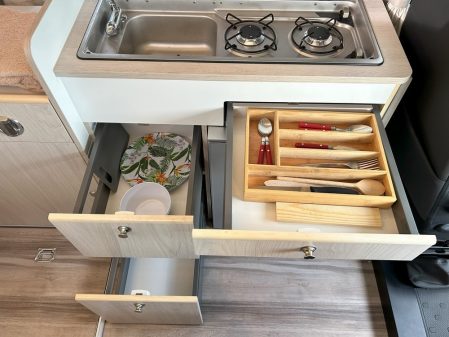 Outre le couchage "King Size", ce V7 LL bénéficie d'un meuble cuisine dans lequel on retrouve un combiné réchaud 2 feux-évier Inox, un frigo en partie basse de 85 l ainsi que différents tiroirs. D'une manière générale, ce van est bien pourvu en rangements, qui sont d'ailleurs parfaitement répartis dans l'ensemble de l'habitacle. Entre la cuisine et le lit, JCG Créations a réussi à dissimuler un WC coulissant avec cassette amovible. Il est possible d'opter également pour des toilettes portables ou sèches. C'est là aussi un des atouts de ce V7 LL qui conserve un petit espace sanitaire. Fidèle à l'esprit JCG Créations, ce van embarque une réserve d'eau propre de 150 l et bénéficie d'une douchette extérieure. Pour l'occasion, le flexible a été changé pour offrir une plus grande longueur d'utilisation. Côté dînette, ce modèle s'appuie sur les sièges pivotants du porteur Renault Trafic, mais également sur un petit sofa logé au niveau de la porte coulissante. Le salon s'accompagne d'une table amovible. Avec ce V7 LL, JCG Créations dispose clairement du couchage le plus grand sur le marché du vans, sans pour autant renier au confort et aux rangements. Pour l'heure, aucun prix n'a encore été communiqué.