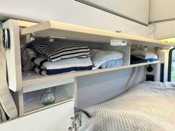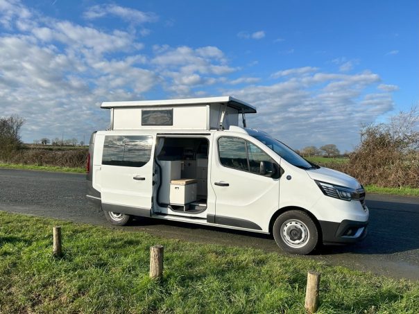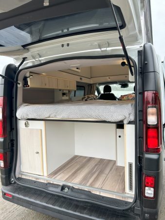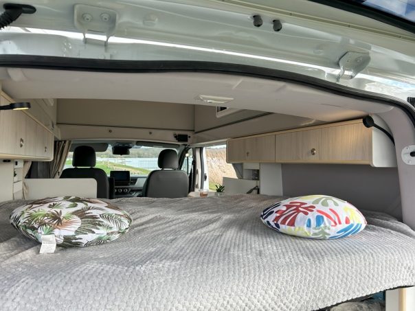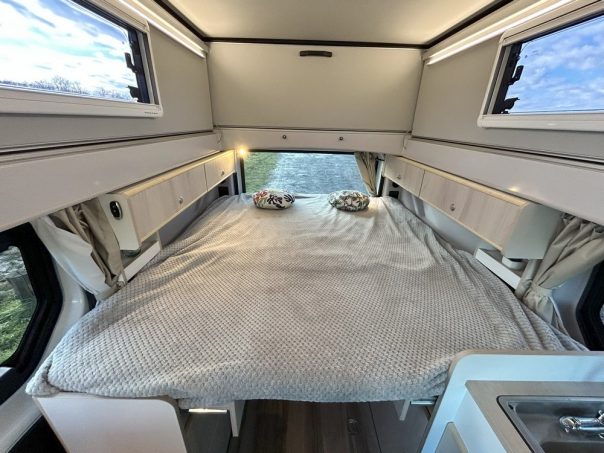 Dans une configuration optimale, le matelas affiche des dimensions de 190 x 196 cm. JCG Créations revendique le fait de pouvoir utiliser ce couchage de trois manières possibles, selon les envies : en transversal, dans le sens de la longueur ou en version lits jumeaux. Pour cette réalisation, l'aménageur a choisi le châssis long du Renault Trafic avec un gabarit de 5,48 m. Evidemment, ce véhicule reprend à son compte l'une des grandes particularités de la marque, à savoir son toit isolé, à parois rigides, relevable électriquement.