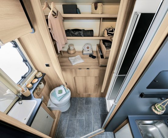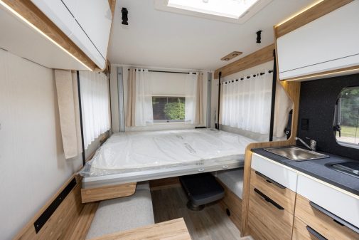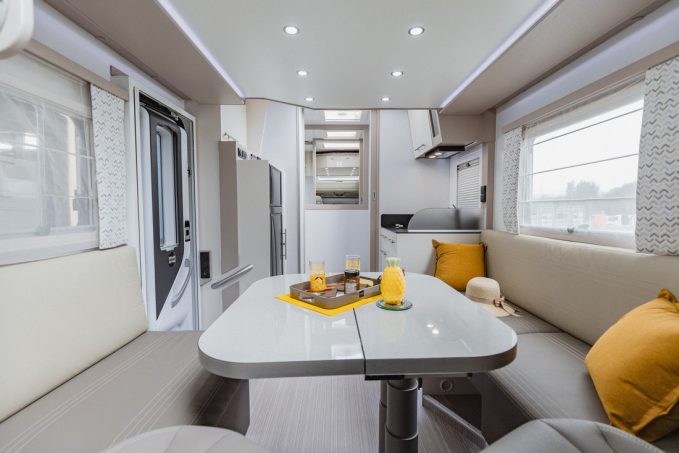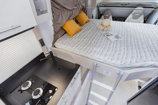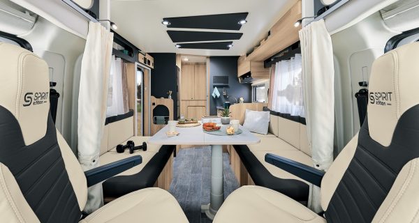 Le profilé Vera fait partie des derniers arrivés dans la gamme d’accès Progress. C’est aussi le modèle le plus court des profilés Notin. Pour autant, ce profilé s’avère très séduisant avec une ambiance singulière parfaitement dans l’esprit de la marque. On appréciera la cuisine très élégante. et l’implantation bien étudiée, apportant de espace et convivialité, notamment dans le salon. Celui-ci se transforme en chambre, en abaissant le lit de pavillon à l’aide d’un moteur électrique.