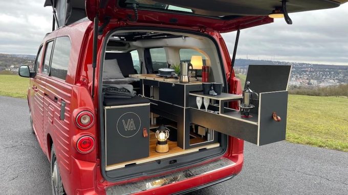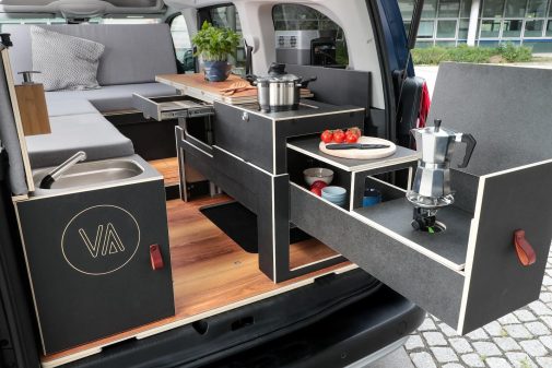 L’aménagement intérieur a été confié à la société Vanderer. Ce e-Berlingo propose pas moins de 4 couchages, dont celui sous le toit relevable évidemment (114 x 193 cm) et la transformation de la banquette en couchage double (120 x 203 cm). Pour le reste, un module en bois est dédié à l’univers de la cuisine avec un vaste tiroir coulissant qui dissimule un réchaud ainsi qu’un évier sans oublier la glacière à compression et des espaces de rangement.