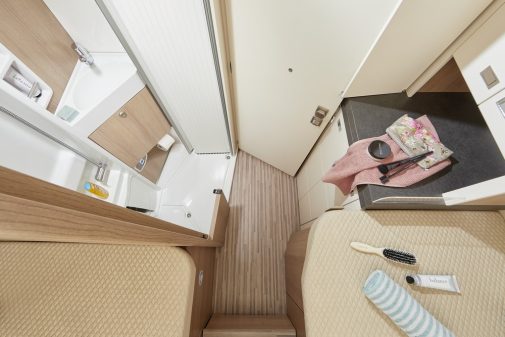 Le succès des Malibu Van s’explique par l’esprit d’innovation à l’image entre autre de la salle d’eau baptisée Flexible « 1000 » que l’on retrouve dans toutes les gammes. Malibu a été le premier constructeur à offrir à ce poste une grande modularité avec notamment un astucieux WC pivotant. Ce dernier s’escamote dans la paroi sous le couchage arrière et libère ainsi l’espace pour la douche dont les panneaux verticaux à lamelles viennent former une cabine totalement isolée.
