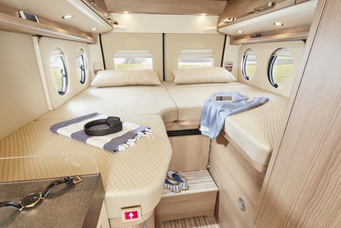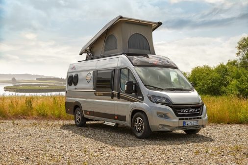 Malibu Van va encore plus loin dans le phénomène de personnalisation et propose sur l’ensemble de ces modèles, la possibilité d’y ajouter un toit relevable. Il s’agit de la variante Family-For-4 et qui intègre donc un couchage double en pavillon dans une structure relevable réalisée en interne associant polyester, mousse rigide RTM et aluminium.