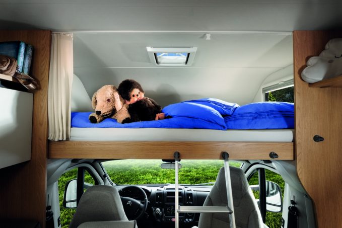 A l’étape, les occupants de la Tourer A690G profitent d’un lit transversal double, sur une grande soute garage, complété en partie avant par la présence d'un lit en capucine évidemment. Le salon peut se convertir si besoin. En ce qui concerne la partie sanitaire, tous les éléments sont réunis dans un cabinet de toilette avec WC et lavabo. Seule la douche profite d'un espace séparé par un rideau Nylon pour isoler la cabine du reste de la salle d'eau.
