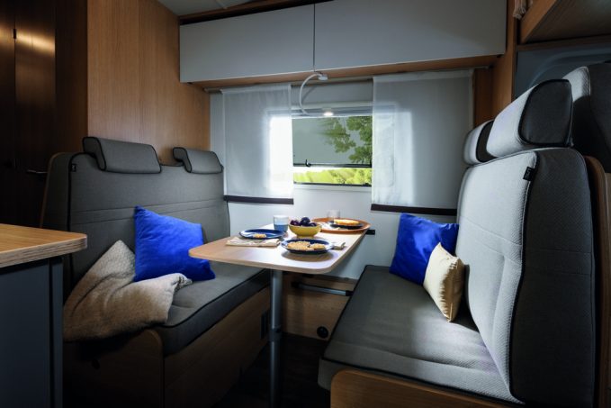Il s’agit de la capucine Tourer A690G, véhicule de 6,99 m de long. La marque propose une implantation plutôt conventionnelle sur le secteur. Ainsi, dans l'habitacle, elle s'appuie en partie avant sur une dînette composée de banquettes en vis-à-vis, l'une face et l'autre dos à la route. Ces assises sont homologuées en place carte grise et permettent, avec les sièges du poste de conduite, d'embarquer jusqu'à 6 personnes à bord et en toute sécurité.