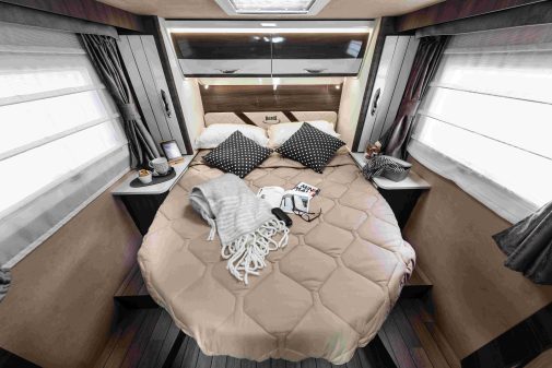 Les acquéreurs d’un profilé Mc4 881 peuvent disposer en option d’un deuxième grand lit positionné en pavillon, au-dessus du salon. Ce couchage s’abaisse et se remonte aisément grâce à un moteur électrique.