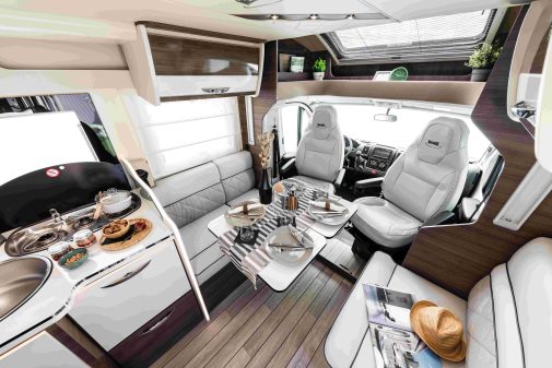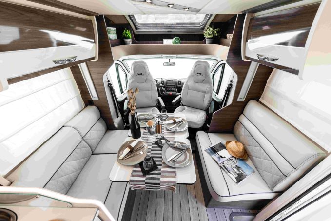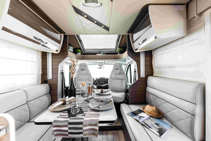L’agencement du maxi-salon correspond parfaitement aux attentes de la majorité des camping-caristes français. Les banquettes en vis-à-vis se convertissent en sièges pour les périodes de roulage. Mais c’est à l’étape qu’on les appréciera le plus. Confortables et élégantes, elles recevront vos invités pour d’inoubliables moments de convivialités.
