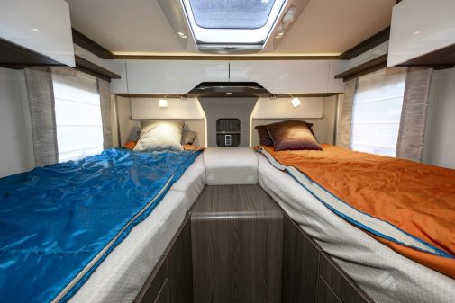 En résumé, cet intégral propose une excellente isolation thermique. A bord, ce modèle bénéficie en partie avant d'un grand salon avec banquette en L, un large sofa latéral et évidemment les sièges pivotants du poste de conduite de la marque Aguti. Au roulage, cette zone permet d'accueillir en toute sécurité, quatre personnes. C'est d'ailleurs le programme proposé par cet intégral en terme de couchages. En effet, au-dessus du poste de conduite est logé un lit de pavillon. Si en temps normal, il est manuel, le véhicule de l'essai reçoit un modèle électrique qui s'abaisse facilement et rapidement. Il propose un couchage de 141 x 190 cm... évolutif. En effet, deux extensions permettent de transformer ce lit transversal en couchages indépendants longitudinaux.