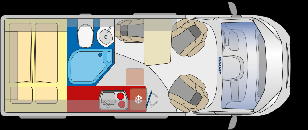 Pössl conserve donc tous les atouts de la gamme Plus pour ce modèle. Ainsi, la motorisation est confiée au bloc 2.2 l de 140 ch ou 165 ch au choix, du Citroën Jumper ou Peugeot Boxer. Ce dernier est en premier lieu homologué de série en 3,5 tonnes de PTAC offrant une charge utile impressionnante de 635 kg. Ce fourgon bénéficie au niveau du porteur d’une prestation de haut vol (volant en cuir, alternateur renforcé 220 Ah, réservoir de gasoil de 90 l, stores de cabine…).