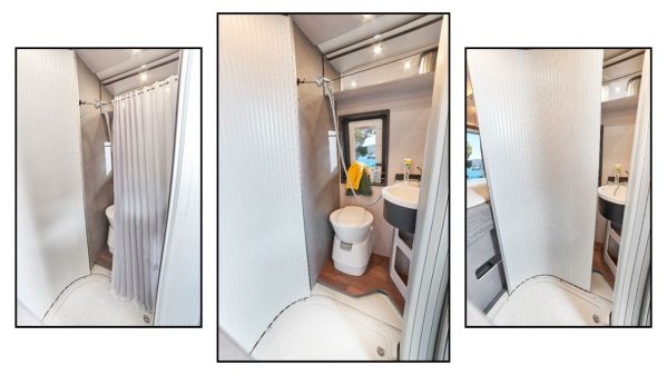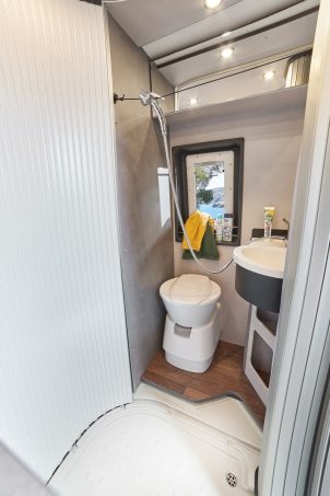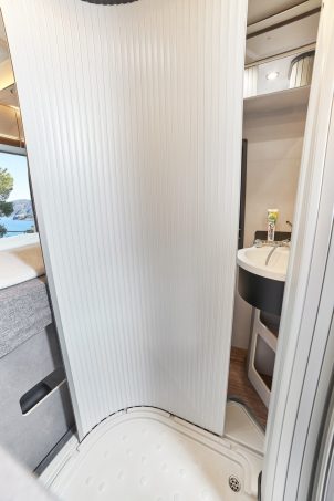 A bord, l'implantation profite d'une habitabilité remarquable. Ce fourgon de 5,99 m de longueur propose une implantation appréciée, inspirée du best-seller de la marque, le Summit 600 Plus. Sauf que son appellation R le différencie par une salle d’eau atypique qui se révèle d'une grande praticité. En effet, Pössl a décidé de développer ce poste en mettant intelligemment à profit le couloir central du véhicule. Les équipements sont facilement accessibles, et l’isolation s’effectue par d’astucieux rideaux coulissants à lamelles. Il est d’ailleurs possible de compartimenter le cabinet de toilette et la douche de manière indépendante.