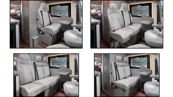 Sur la partie avant, le Summit Shine 600 R Plus accueille un agréable salon avec une vaste table pourvue d’une rallonge pivotante. Mais ce coin repas cache bien son jeu, car Pössl a décidé sur ce poste de faire preuve d’originalité et d’inventivité. En effet, ce Summit Shine Plus propose quatre variantes d’assises au confort digne d'une berline. Dans l’habitacle, il est possible d’opter pour un ou deux sièges baquets individuels, une banquette double… ou pour les indécis, un combiné des deux avec une banquette double associée à une assise individuelle. Ce fourgon aménagé peut donc voyager en toute sécurité avec trois passagers à son bord en plus des deux assises du porteur. Du jamais vu dans l’univers du fourgon !