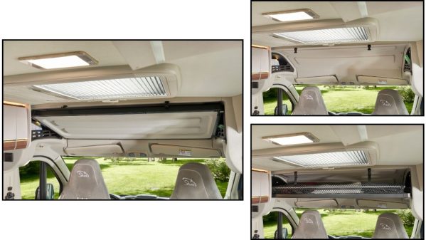 Plus discret mais tout aussi audacieux, le MultiRoof, symptomatique de l'appellation Shine, offre une flexibilité supplémentaire aux occupants de ce fourgon. Si la tendance du marché est à la découpe de cabine pour gagner de la hauteur, Pössl ne se ferme pas à l'idée de bénéficier d'un rangement complémentaire au-dessus du poste de conduite. L'aménageur propose donc le MultiRoof, une tablette amovible qui peut être rabattue contre le pavillon pour libérer l'espace, ou positionnée à mi-hauteur pour constituer une niche ouverte propice au rangement. Autre astuce intéressante : il est possible de l'enlever entièrement pour libérer totalement la hauteur et donner une sensation d'espace impressionnante.