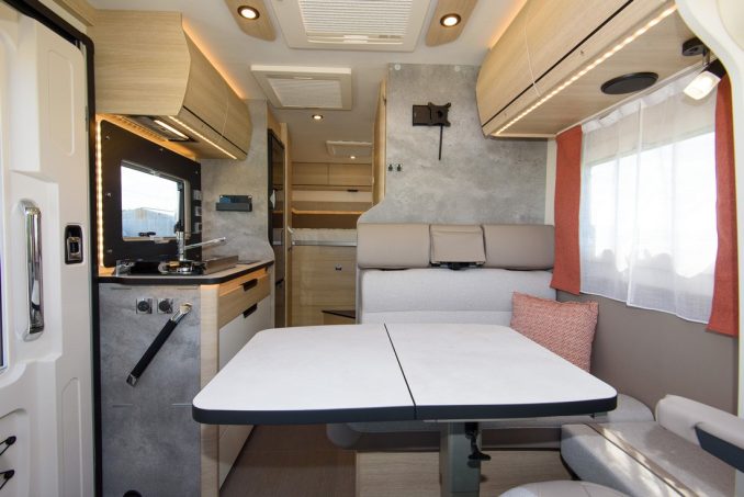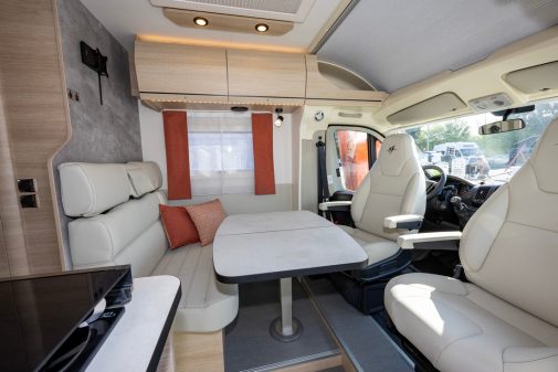 En optant pour des lits jumeaux dans le C55, Rapido conserve un bel espace de rangement en soute – une hauteur de 1,20 m qui n’est pas négligeable. Du côté aménagement de la cabine, ce profilé présente une habitabilité appréciable, avec des espaces généreux sur chaque poste. Le C55 profite d’un salon qui se compose des sièges pivotants du porteur Peugeot et d’une banquette à l’étonnant retour en L. La salle d’eau reprend le dispositif Duo’Space, que l’on retrouve régulièrement dans les fourgons : une cloison pivotante qui optimise l’espace… tout simplement.