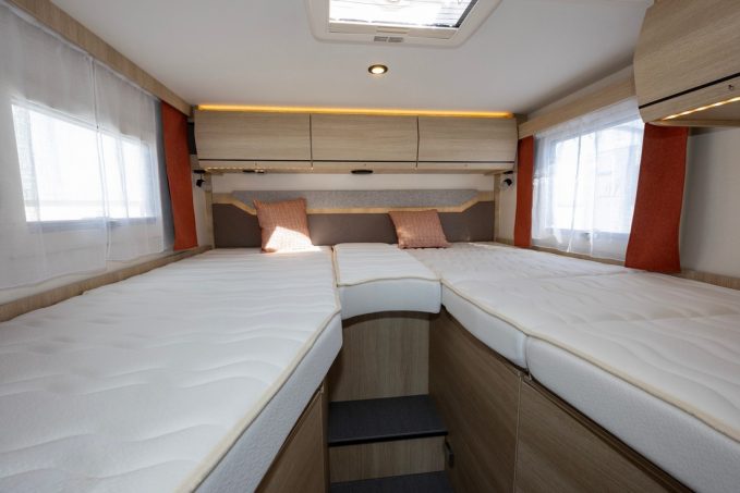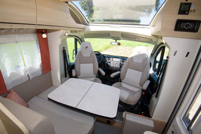 Le C55i reprend la même implantation que le C55 , déclinée cette fois dans un intégral. Les dimensions restent identiques aussi, mais le C55i reçoit des couchages supplémentaires. On y retrouve donc des lits indépendants et – un des avantages de cette catégorie de camping-car – un lit de cabine, dans la partie avant. Ce couchage est installé de série et peut recevoir deux personnes (140 x 185 cm). Ce modèle Rapido est disponible à partir de 82 900 €, sur le porteur Fiat Ducato avec la motorisation 2,2 l de 140 ch.