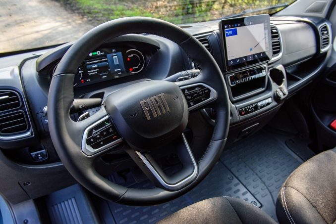 Le nouveau Fiat Ducato électrique voit son poste de pilotage énormément évoluer. Rassurez-vous, le volant est toujours là, comme le tableau de bord. Mais ils ont été profondément remaniés. L'instrumentation change ainsi diamétralement, les fameuses aiguilles laissant place à une dalle numérique où il est possible de choisir plusieurs interfaces, aussi bien pour son confort personnel que pour surveiller ses performances et son éco-conduite, ce qui est toujours important sur un véhicule électrique.