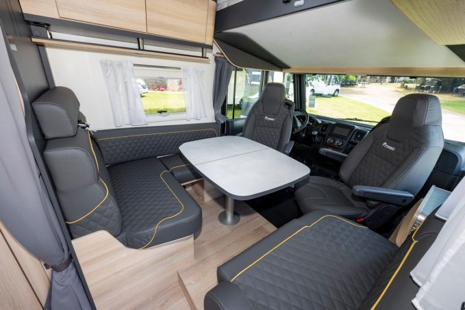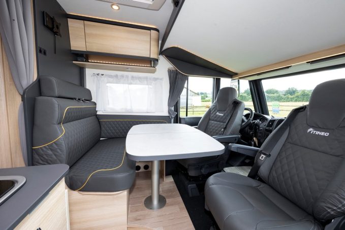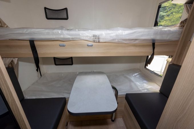 Malgré sa largeur (2,19 m), le CS660 se destine à un usage familial : une zone dédiée aux enfants avec des lits superposés (70 x 202 cm), précédés d’un petit salon avec des sofas individuels en vis-à-vis. Cette dînette exclusive peut se convertir en lit et ainsi augmenter la surface d’accueil du matelas inférieur (130 x 202 cm). Pour les parents, le couchage se situe au-dessus du poste de conduite. Tous peuvent se retrouver dans le salon, un coin composé d’une assise en L et des sièges pivotants du porteur Peugeot en sus.