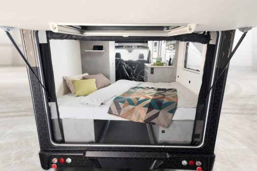 Dernière idée du bureau d’études de Dethleffs, le Yoka Go. Ce véhicule se démarque par son ultra-­compacité et son aspect épuré. En effet, outre la dînette arrière (convertible) et la penderie fixe, ce profilé est dépourvu d’un quelconque aménagement, ce qui permet ainsi de laisser libre cours à ses desiderata – à piocher dans le catalogue des options. Les placards de pavillon sont remplacés par des valises amovibles, la cuisine est optionnelle, au même titre que les assises des passagers arrière. Ce véhicule s’inscrit dans une démarche de “véhicule à faire soi-même”.