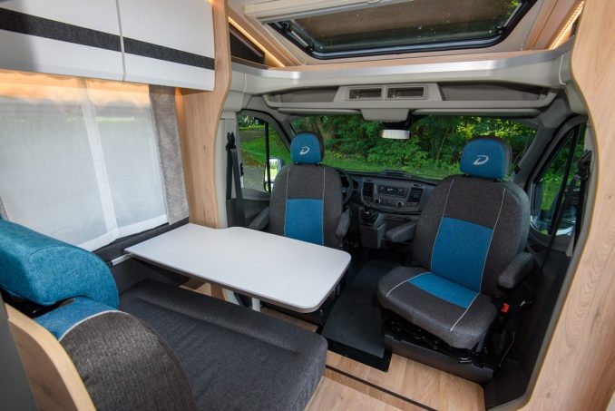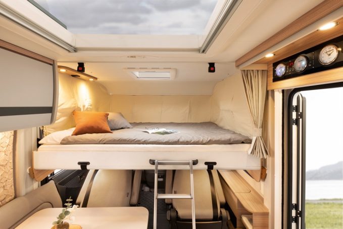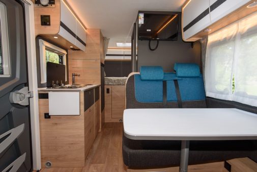Avec sa série Globebus Go, Dethleffs commercialise des profilés étroits, positionnés en entrée de gamme. Il faut tout de même débourser presque 68 000 € pour le T15. Bridé au châssis Ford Transit, ce véhicule de 5,99 m de long bénéficie en chambre arrière d’un lit transversal sur soute garage. Ce couchage s’accompagne d’une salle d’eau avec paroi pivotante. La zone de vie est confiée à une dînette pouvant accueillir quatre personnes, dans la partie avant, et convertible en lit simple si besoin.