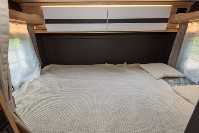 Si les profilés sont exclusivement vendus sur Ford Transit, les intégraux Dethleffs sont proposés avec le châssis-­auvent de Fiat Ducato. La largeur reste néanmoins commune aux deux carrosseries : 2,20 m. Le Globebus I6 est un intégral de 6,95 m de long qui peut confortablement recevoir quatre personnes aussi bien sur route qu’à l’étape. Il dispose, en plus du couchage de cabine double, de lits jumeaux en chambre arrière qui peuvent être réunis. La banquette en L profite de ceintures de sécurité. Ce véhicule est vendu 88 380 €.