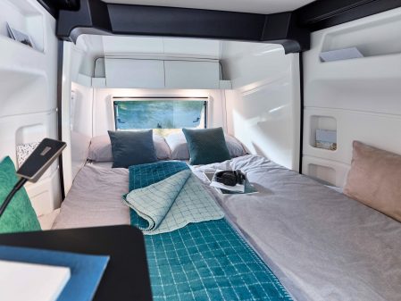 Dans une longueur inférieure à 6 mètres, le CS-Reisemobile Duo propose un mix entre couchages superposés, lits à la française et salle d’eau arrière. Concrètement, il dispose ses deux coutils une place l’un au-dessus de l’autre à l’arrière gauche tandis que la partie sanitaire (cabinet de toilette, douche et WC) occupe le reste de l’espace à droite. Etonnant. Pour le reste, ce Duo se montre nettement plus conservateur avec une belle cuisine à l’entrée et une dînette articulée autour des sièges de cabine pivotants et d’une banquette face route. Le CS6Reisemmobile profite de sa base Mercedes Sprinter pour se décliner en version quatre roues motrices, le Duo Independant (109 600 €).