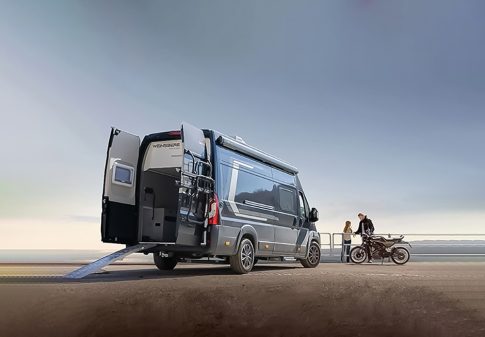 Unique en son genre, le Weinsberg 630 MEG [Outlaw] est le seul fourgon à proposer un garage étanche à l’arrière. Une spécificité qui le destine aux amoureux de sports mécaniques : moto, quad, karting. Décliné dans les gammes CaraBus et CaraTour, il repose sur la base Fiat Ducato en H3 (2,80 m de haut). Il dispose donc d’une soute fermée par une porte étanche qui l’isole hermétiquement de la partie habitation, dont la dînette et la salle d’eau restent classiques. Le lit longitudinal est, lui, disposé au-dessus du garage. Ce parti pris n’est pas sans conséquences, puisqu’ici aucune modularité n’est possible. L’[Outlaw] répond donc à un besoin bien spécifique et ne satisfera pas à ceux qui souhaitent un véhicule polyvalent.
